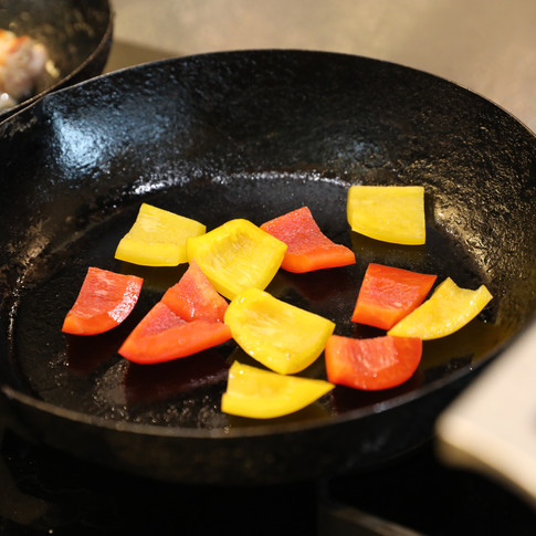 そして、それぞれ別のフライパンで、パプリカとズッキーニを焼きます。 一つ一つの食材で火の入り方が違うので別々に焼くことが大事。 パプリカには塩を振り脱水することで素材が持っている旨味を引きだすことができるし、 ズッキーニは、何も手を加えず、表面に汗をかいてきたら裏返す。すると焼き色がついている。 どちらも「焦がす」ことがポイント!