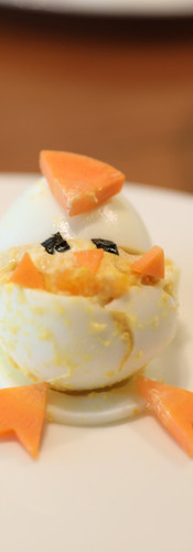 そして、まず最初に作ったのは、ミモザ卵。 茹で卵をひよこの帽子と身体に切り分けて、中の黄身にマヨネーズとシーチキンを入れて卵のなかにもどし、目と口ばしと足をつければ出来上がり!